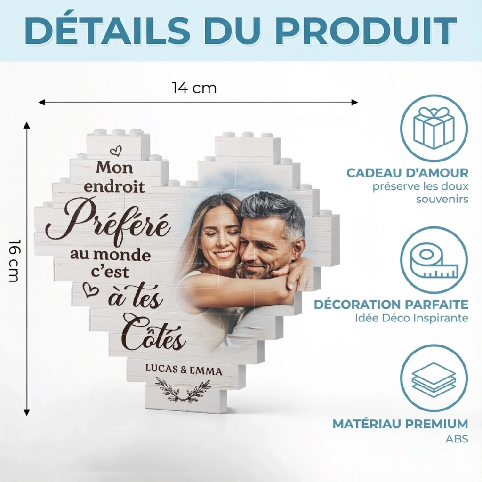 Si vous cherchez un article qui conserve les souvenirs durablement, ce produit est exactement ce qu’il vous faut. Parfait comme ajout charmant à votre maison – il rayonne d’élégance et de positivité. Le cadeau idéal pour toutes les occasions : anniversaires, fêtes, noces, remises de diplômes, Saint-Valentin, fête des Mères, fête des Pères ou simplement pour faire plaisir ! Pour vos amis, votre famille ou cette personne spéciale, ce cadeau polyvalent est garanti pour apporter de la joie et créer des souvenirs durables.